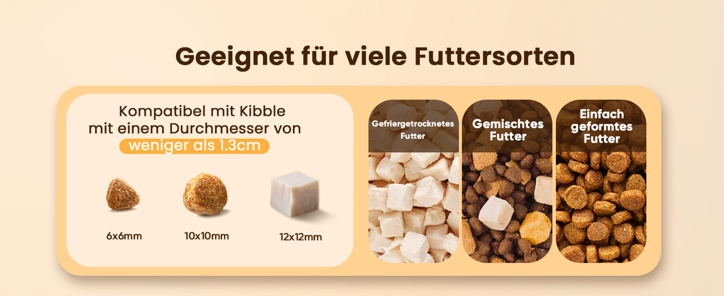 3. Kompatibilität mit Futterarten: Stellen Sie sicher, dass der Futterspender für Trocken- und/oder Nassfutter geeignet ist, je nach Ihren Bedürfnissen.