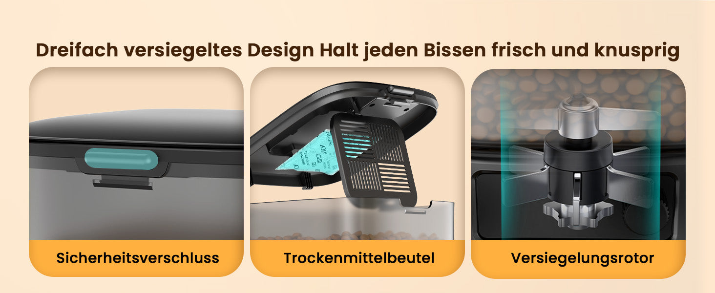 • Luftdichter Deckel mit Trockenmittel hält das Futter frisch und trocken