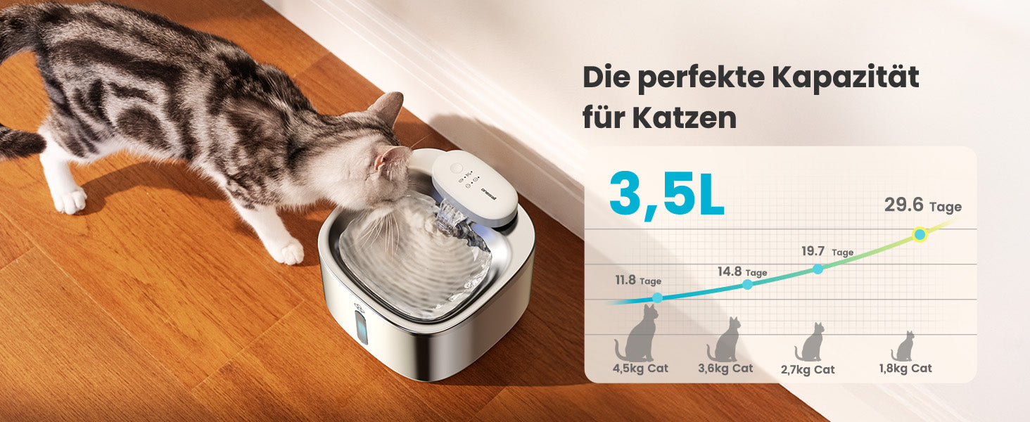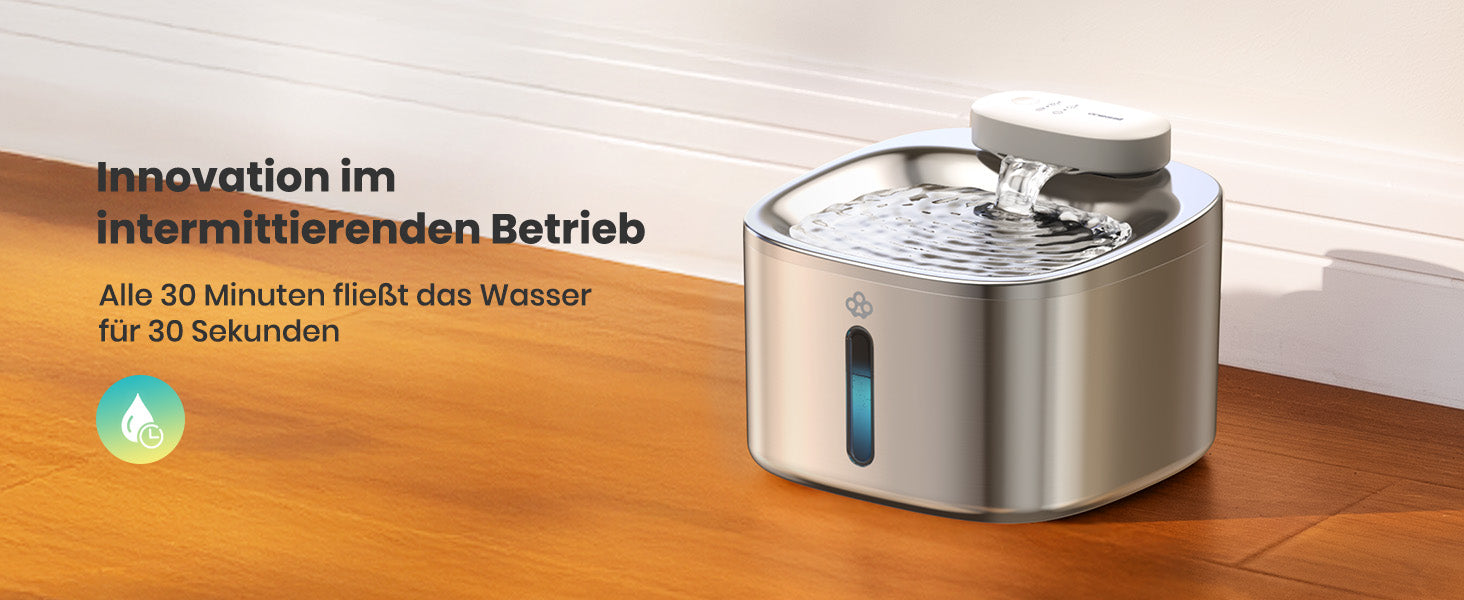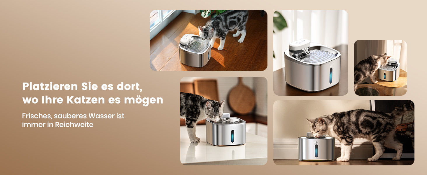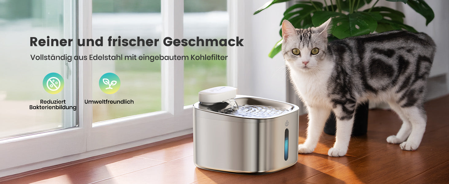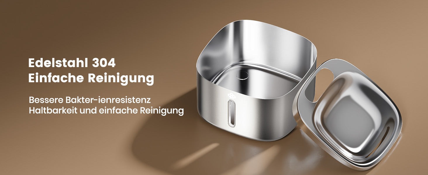 Ein Trinkbrunnen aus Edelstahl ist langlebig, hygienisch und leicht zu reinigen. Edelstahl verhindert die Ansammlung von Bakterien und schützt vor unangenehmen Gerüchen, sodass Ihr Haustier stets sauberes und frisches Wasser hat.