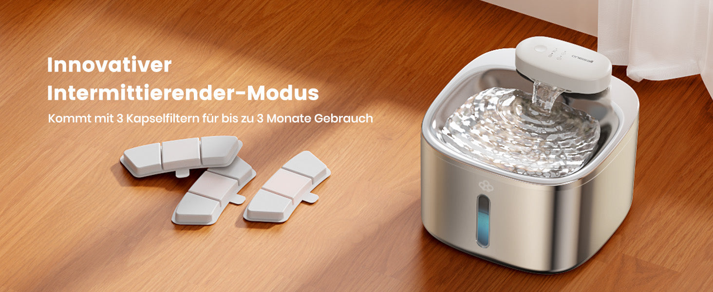 Es wird empfohlen, den Brunnen mit Filterset zu verwenden. Etwa vier Filter sollten pro Monat gewechselt werden. Prüfen Sie regelmäßig den Filter und wechseln Sie ihn gemäß den Herstellerangaben.