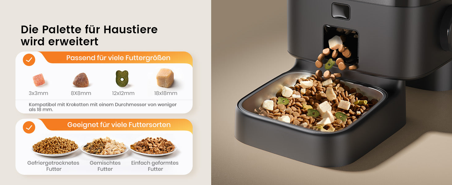- Kompatibilität mit Futterarten: Stellen Sie sicher, dass der Futterspender für Trocken- und/oder Nassfutter geeignet ist, je nach Ihren Bedürfnissen.